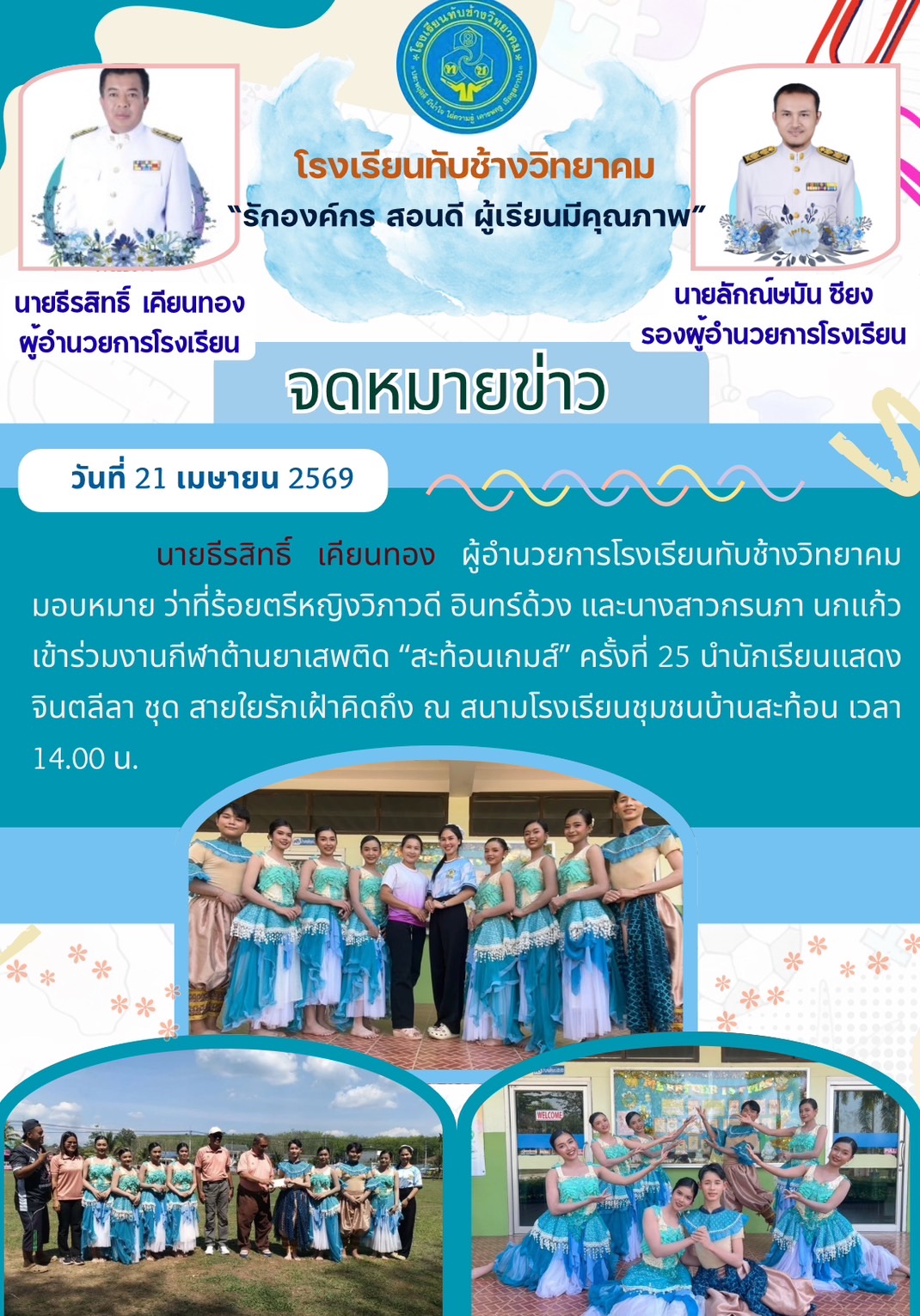 กิจกรรมงานกีฬาต้านยาเสพติด "สะท้อนเกมส์" ครั้งที่ 25 ได้นำนักเรียนแสดงจินตลีลา ชุดสายใยรักเฝ้าคิดถึง ณ สนามกีฬาโรงเรียนชุมชนบ้านสะท้อน