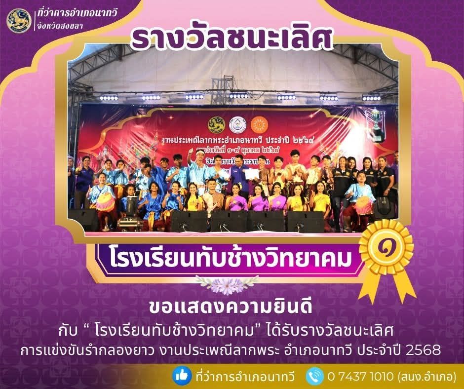 การประกวดรำกลองยาวงาน ประเพณีลากพระอำเภอนาทวี ประจำปี 2568 โรงเรียนทับช้างวิทยาคม ได้รับรางวัลชนะเลิศ เงินรางวัล 10,000 บาท