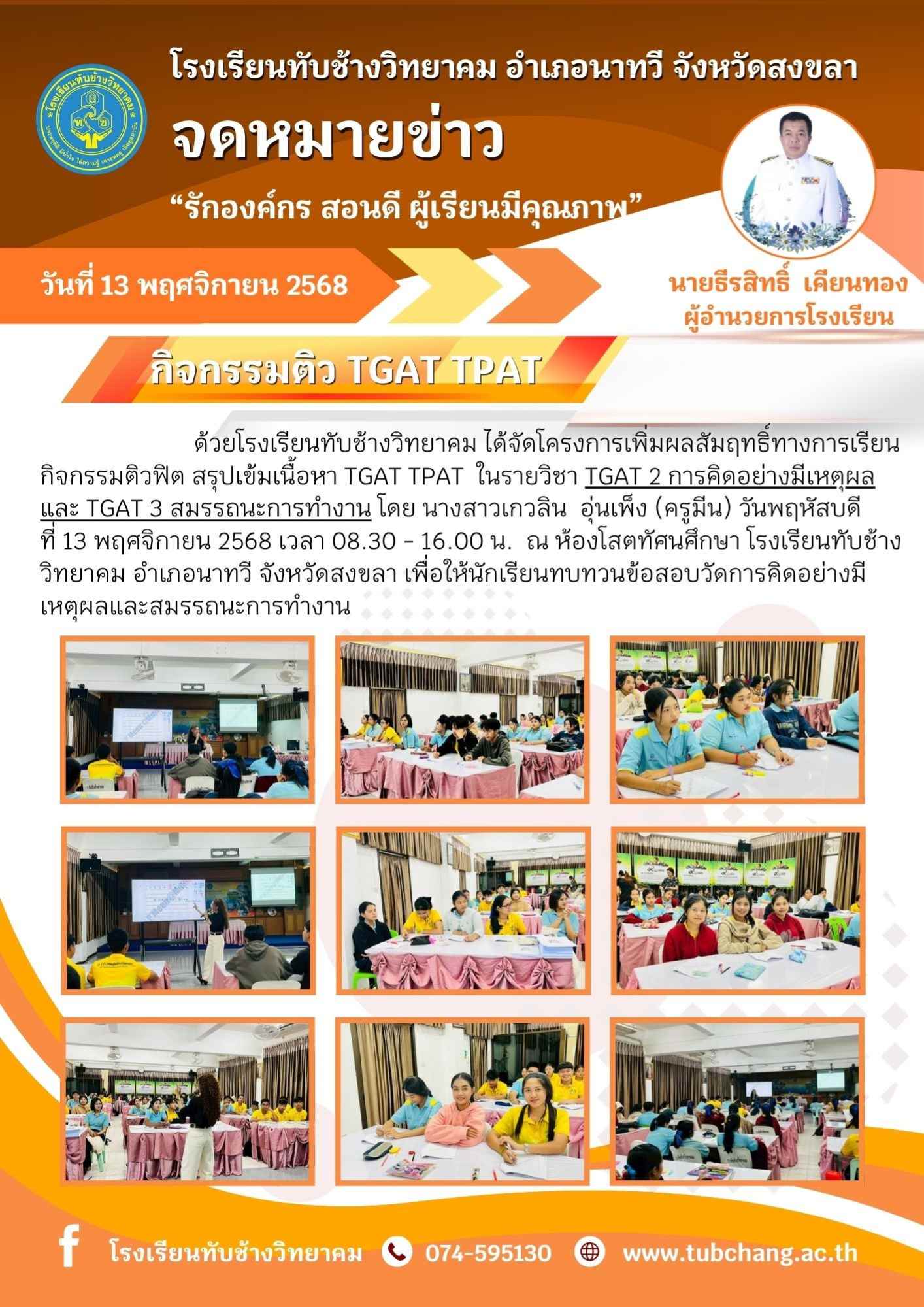 กิจกรรมติว TGAT TPAT วันที่ 12 - 14 พ.ย. 2568 ณ ห้องโสตทัศนศึกษา โรงเรียนทับช้างวิทยาคม