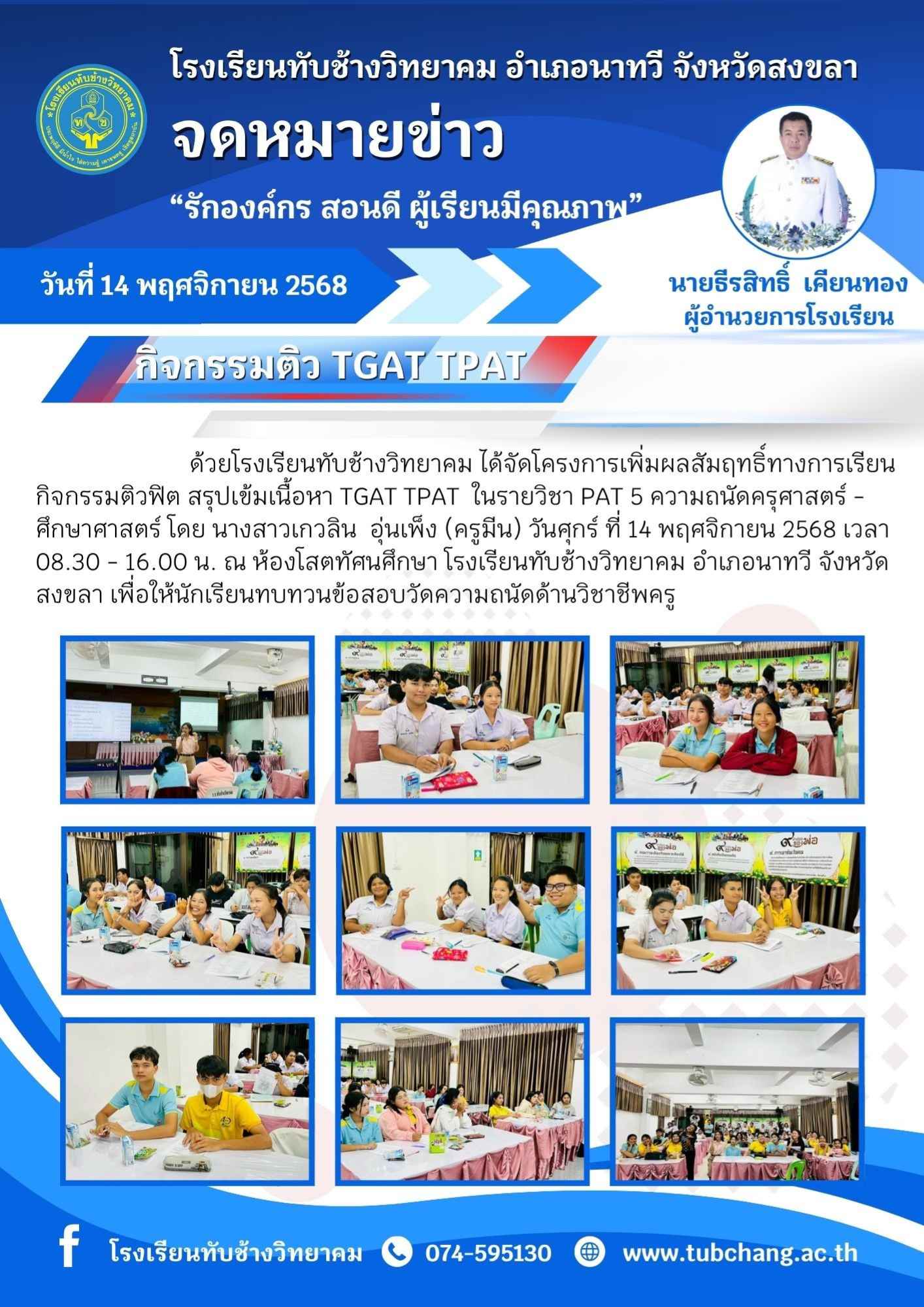 กิจกรรมติว TGAT TPAT วันที่ 12 - 14 พ.ย. 2568 ณ ห้องโสตทัศนศึกษา โรงเรียนทับช้างวิทยาคม